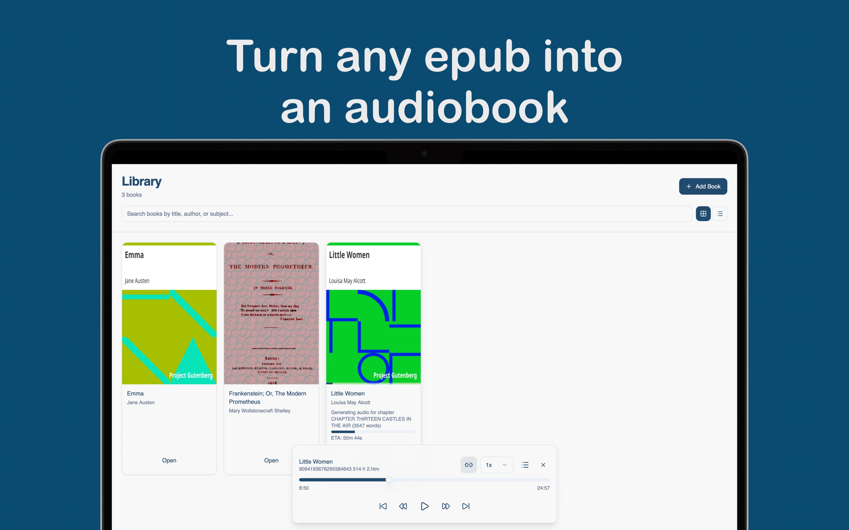 Aurorabook is a EPUB to audio converter app that allows you to convert your EPUB books into audiobooks with one click.